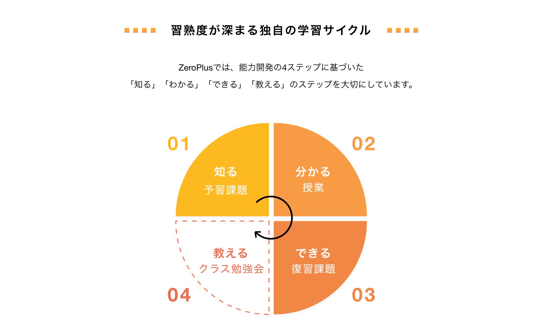 授業で基礎知識をインプットし、課題でアウトプットするという従来の学習方法とは異なり、課題でインプットをし授業でアウトプットするという「反転学習」を導入しており、自走力を身につける独自の学習サイクルで授業を展開しています。