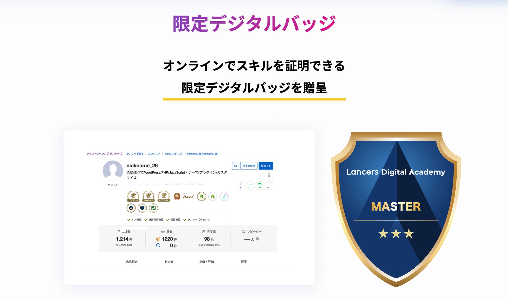 「ランサーズデジタルアカデミー コラボレーションコース」より「ZeroPlus(ゼロプラス)Web制作コース」を受講した場合、卒業時のスキルに応じて優先的に「ランサーズデジタルバッジ」が贈呈されます。