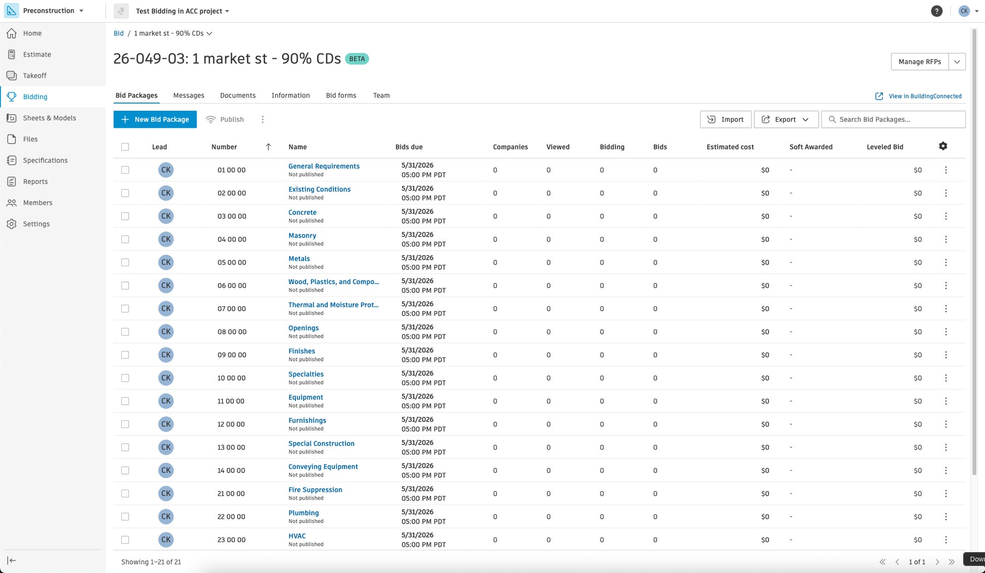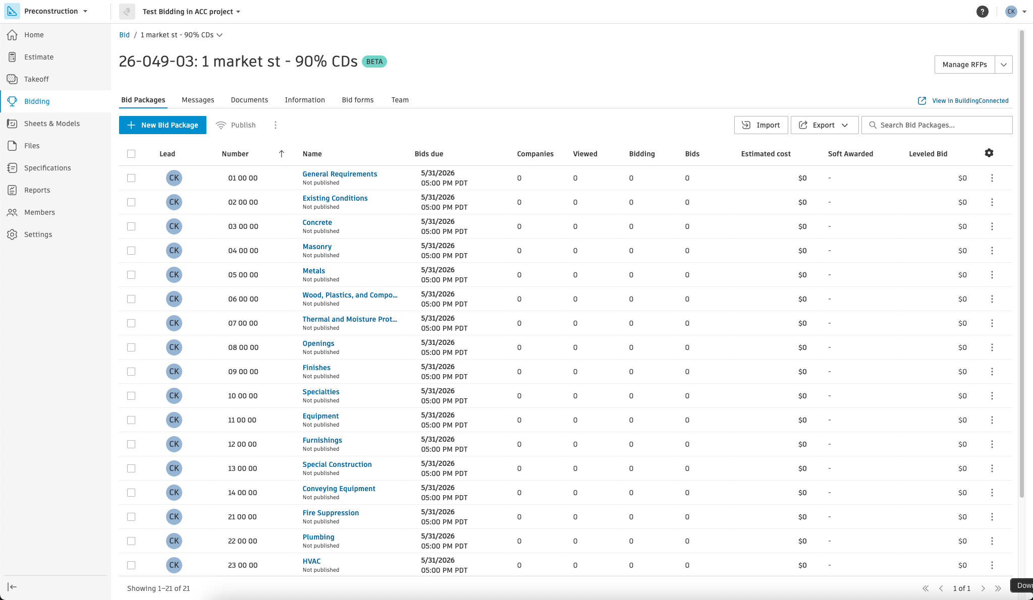 同日、BuildingConnected で実績のある入札管理ワークフローを、Forma の Preconstruction 機能に直接統合した「Bidding」(相見積)ツールのベータ版を提供開始します。Takeoff(数量拾い)および Estimate(見積)と同一の環境上で入札機能を利用可能にすることで、接続されたプロジェクトの文脈の中で複数の提案依頼(RFP)を管理し、価格設定や資格評価に関する調整を効率化するとともに、Preconstruction 業務全体においてよりシームレスなコラボレーションを実現します。