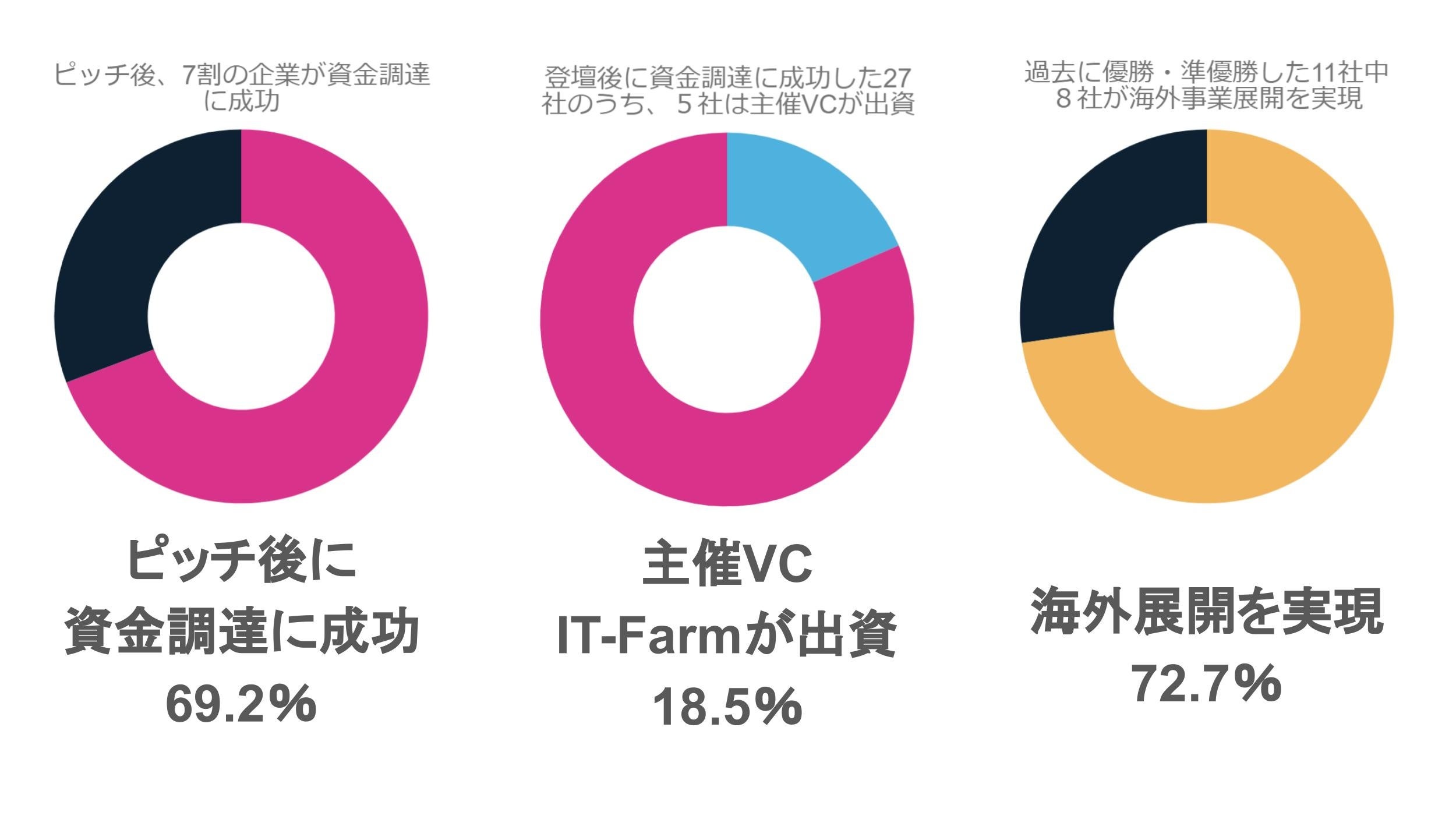 XTC日本大会は、ピッチ登壇社の資金調達の高い成功率が特徴です。XTC JAPAN 2020-2023のファイナリスト39社のうち27社は登壇後に資金調達に成功しており、そのうち5社は主催VCであるIT-Farmが出資。過去に優勝・準優勝した11社中8社は今では海外事業展開を実現しており、XTC JAPANは事業性や世界的ポテンシャルの高いテクノロジー・スタートアップが数多く参加しています。