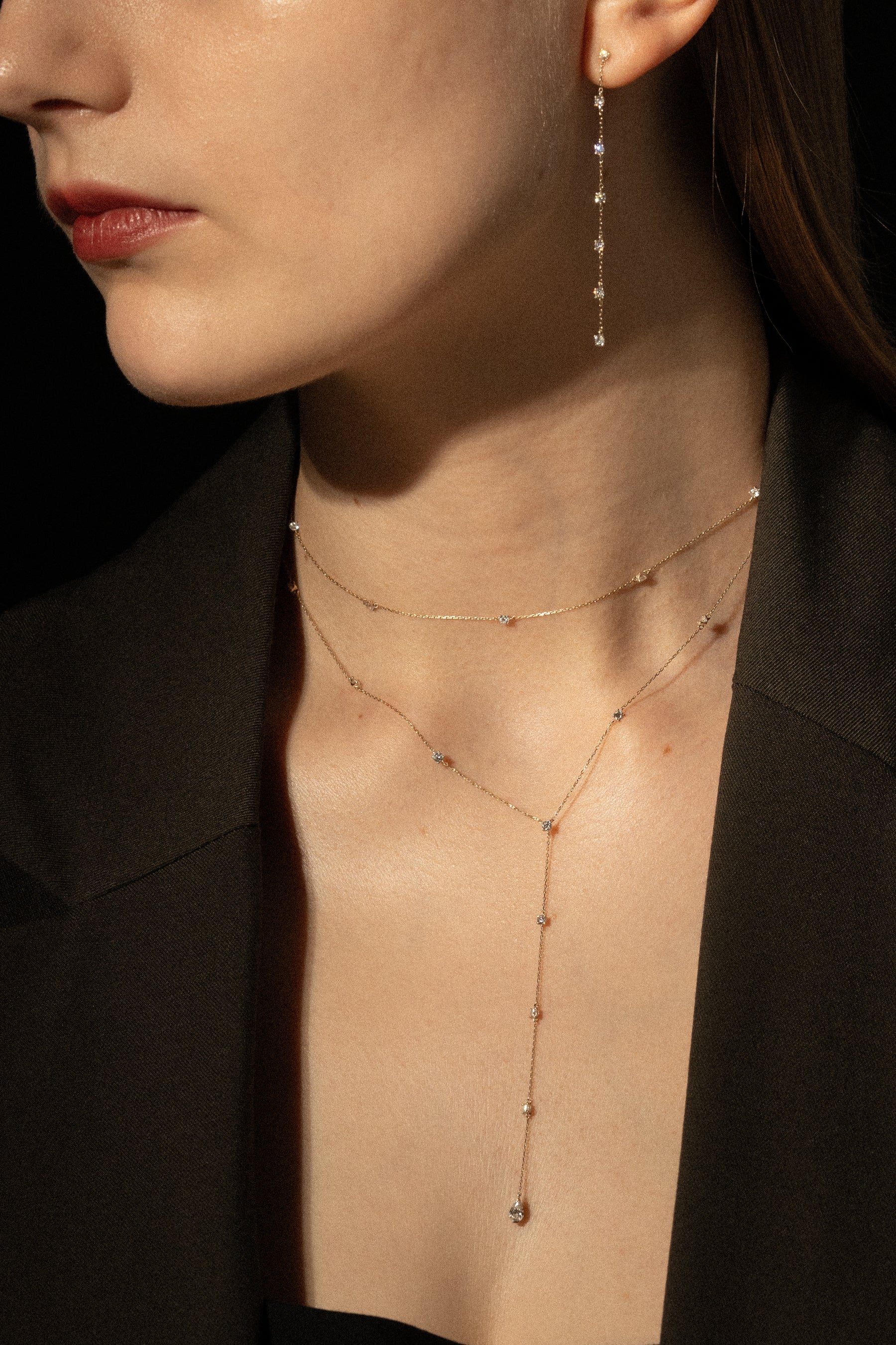 等間隔に配置されたダイヤモンドのジュエリーたちは、まるで時を紡ぐように、人生の架け橋を表現。