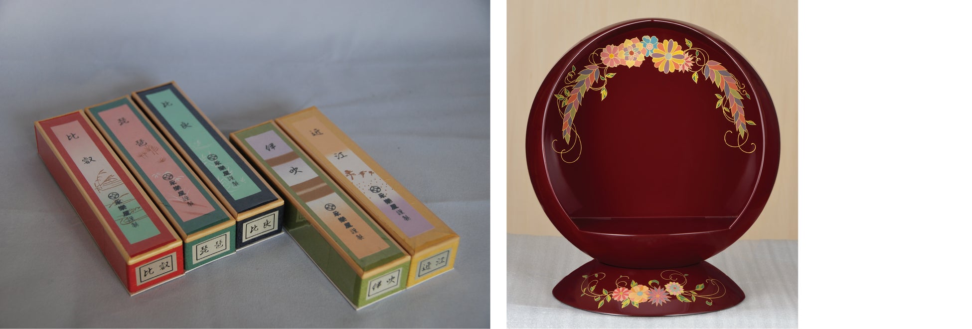 彦根仏壇の伝統技術を活用して制作した小物(小型厨子、木製 塗り蒔絵入 招き猫、彦根城世界遺産登録応援バッチ、謹製線香、ひこにゃん蒔絵シール 他)