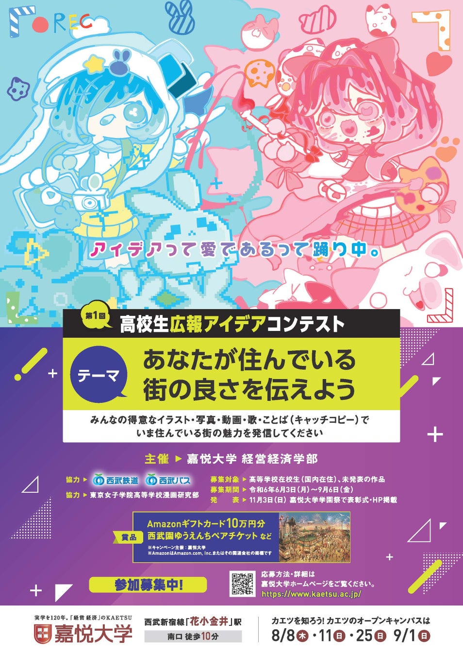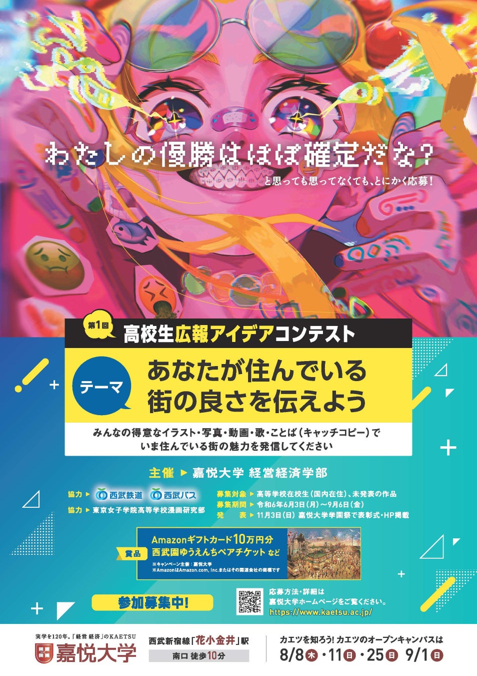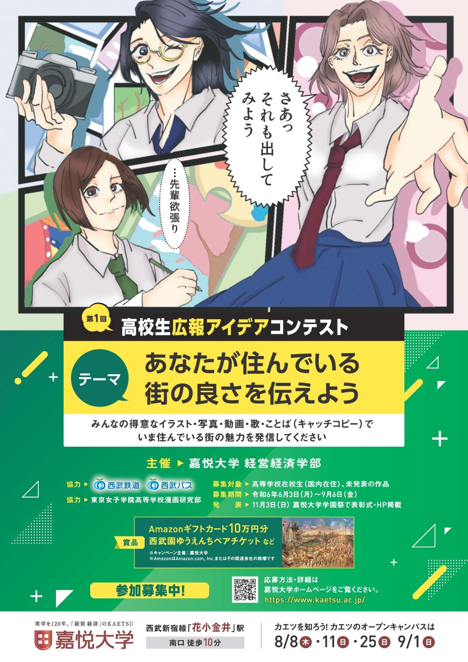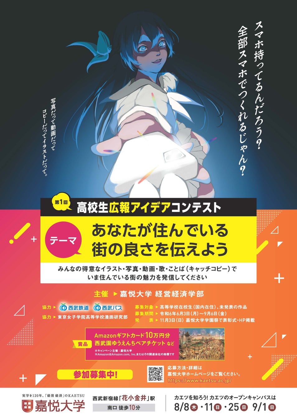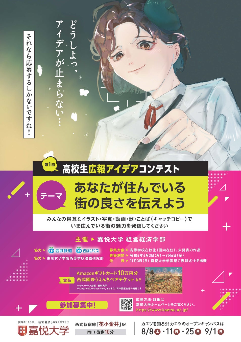 嘉悦大学(東京都小平市/学長:森本 孝)は、国内在住の高校生対象に、未来の“広報クリエイティブ人材”の育成を支援するための「第1回高校生広報アイデアコンテスト」を実施中です。子どもたちの夏休み期間中、交通広告も実施いたします。