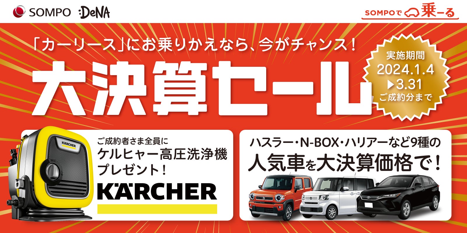 2024年1月4日から2024年3月31日までの間で、「SOMPOで乗ーる」でご成約者さま全員にケルヒャー「K MINI」をプレゼントいたします。