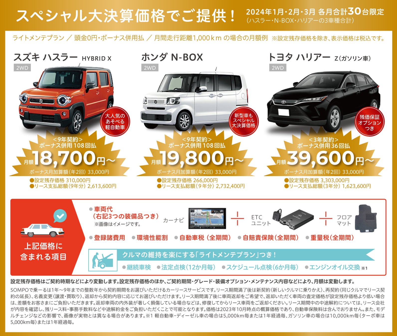 2024年1月・2月・3月の各月合計30台※限定で、「SOMPOで乗ーる」で人気の3車種を大幅値引きでご提供します。※ハスラー、N-BOX、ハリアーの3車種合計