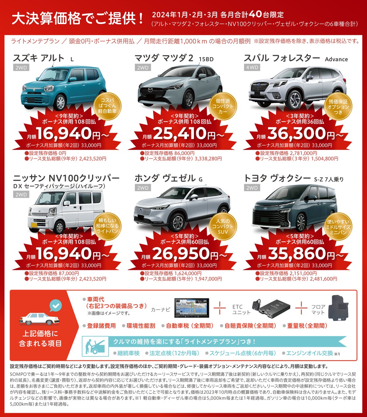 さらに、2024年1月・2月・3月の各月合計40台※限定で、「SOMPOで乗ーる」で人気の6車種を大幅値引きでご提供します。※アルト、マツダ2、フォレスター、NV100クリッパー、ヴェゼル、ヴォクシーの6車種合計