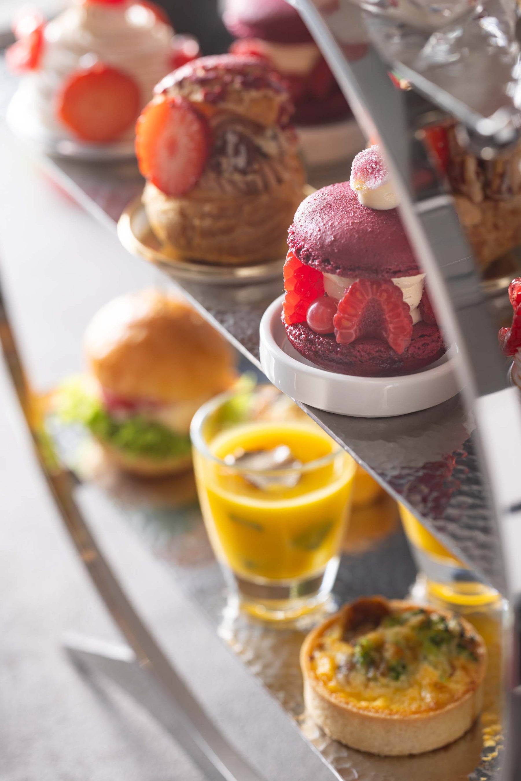 シャンパンといちごが織りなす爽やかな酸味と甘みのバランスが秀逸な「シャンパンフレーズ」や、ほろほろに煮込んだ牛肉がたっぷりの「牛肉のブルゴーニュ風キッシュ」、旬のズワイ蟹といちごをマリアージュさせた意外性のある一品をミニバーガースタイルでお召し上がりいただく「ズワイ蟹・いちごとマスカルポーネチーズのスライダー」、かぼちゃ本来の味とトリュフの香りをお楽しみいただける「かぼちゃのヴェルーテ」などセイボリーも充実。