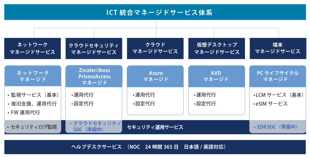 ICT統合マネージドサービスでは以下のサービスをご用意しており、お客様のご用件を元にサービスを組み合わせて最適な運用サービスを提供致します。