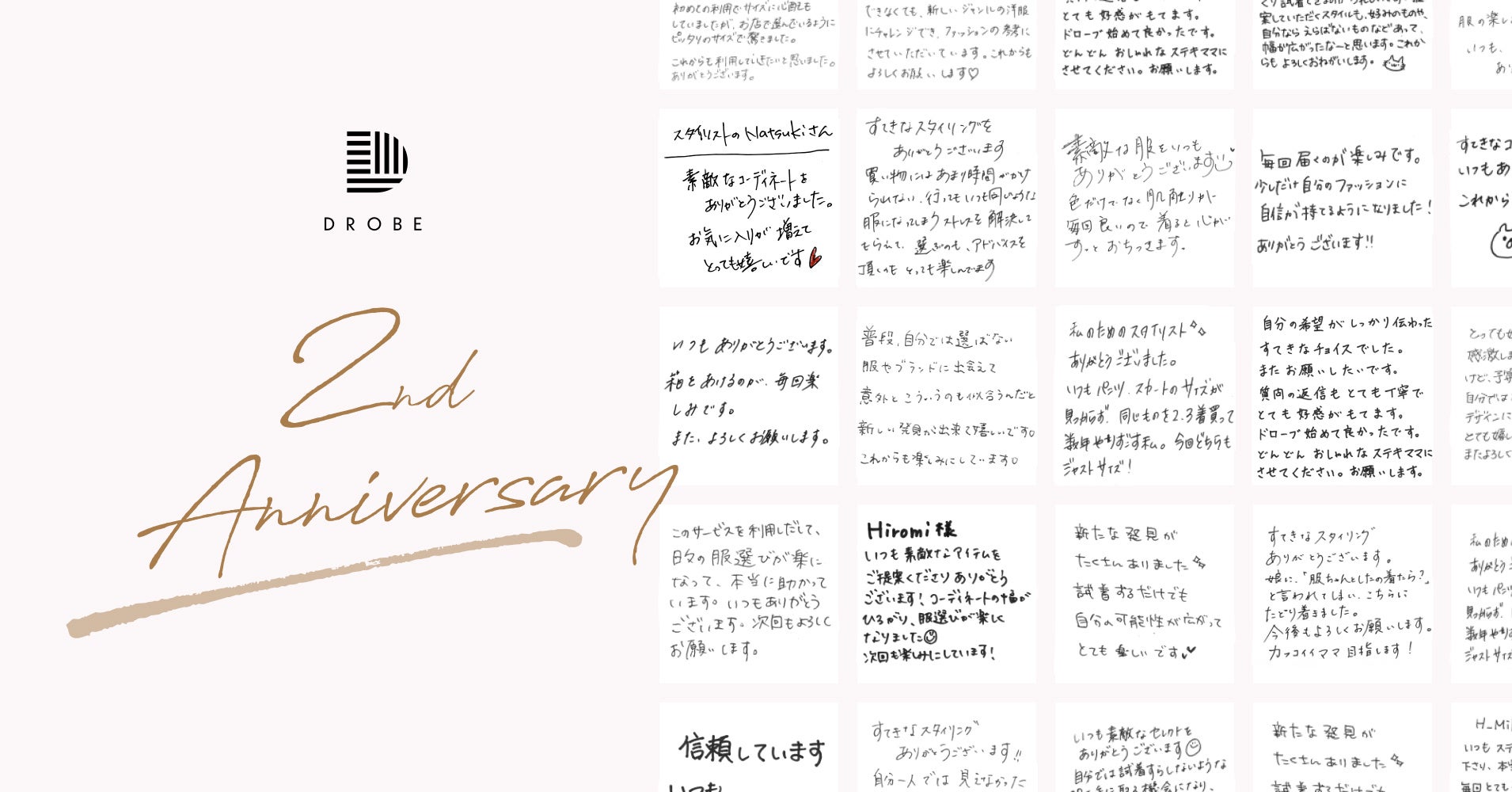 DROBEを日々ご利用いただきありがとうございます。2周年を迎えられたこと、また、700通ものお手紙を頂き、本当に嬉しいです。皆さまがもっと自分らしくファッションを楽しめるよう、これからもスタイリストと共に心を尽くしてまいります。