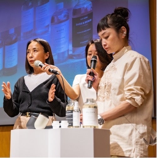 2021年、コロナ禍で⽒が⽴ち上げたボディウェアブランドTWの“⼥性を輝かせる”タイムレス、シンプルで永く着るというコンセプトを例に挙げ、⾃⾝もスローファッションに移⾏しているマインドやコロナがファッション業界に与えた影響や傾向について語りました。またスタイリストとして⽇々⾼価な洋服をレンタルして扱うことから、⾐類を傷めずに時短ケア出来るスチーマーは必須で⽇常使い。⽇々のケア⽅法をユーモアを交えたデモンストレーションにて披露し、お洒落なスチーマーでモチベーションを上げ、楽しくケアしましょう。という呼びかけに来場者達もメモを取り、⼤きく頷く様⼦も!
