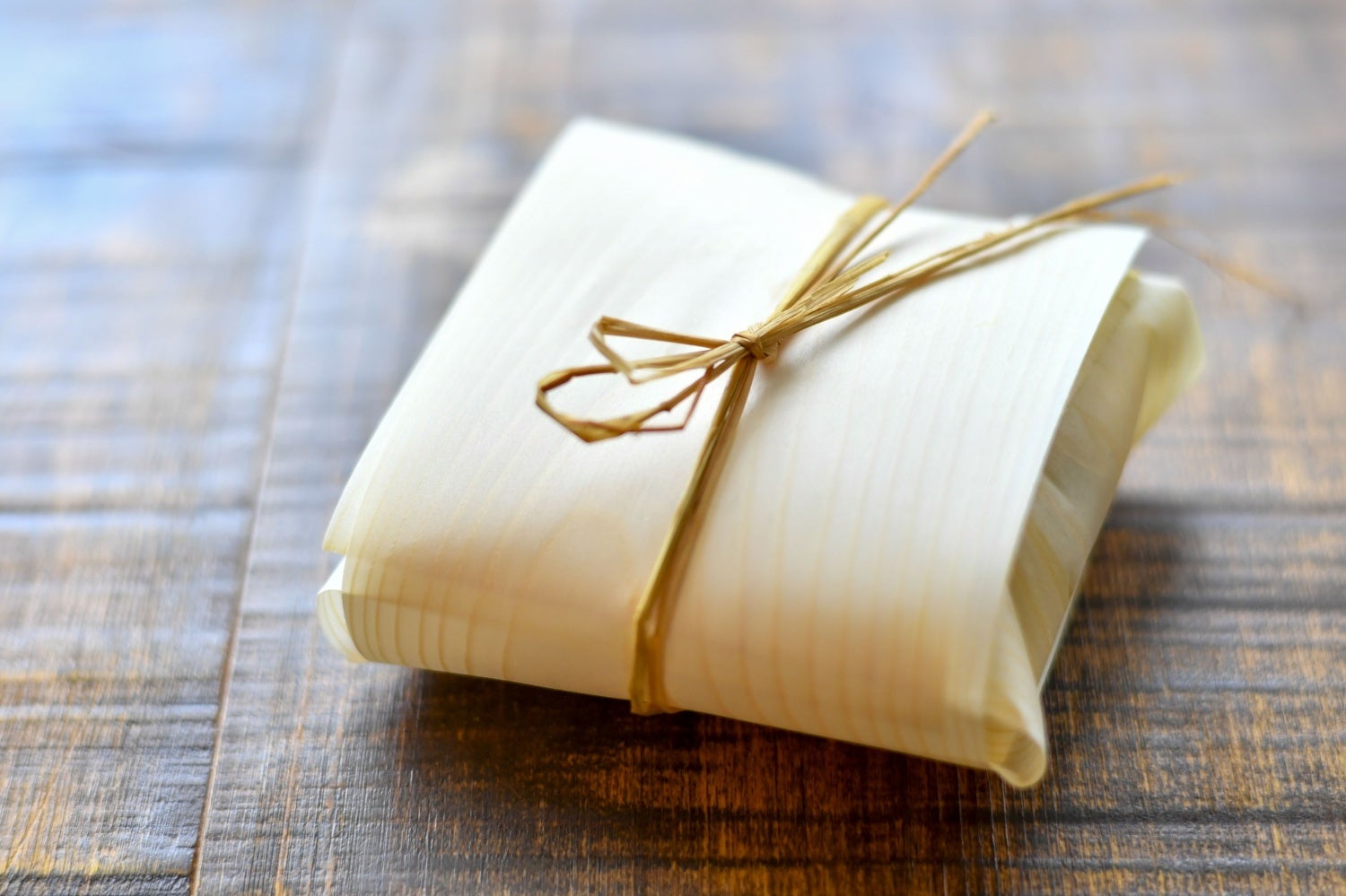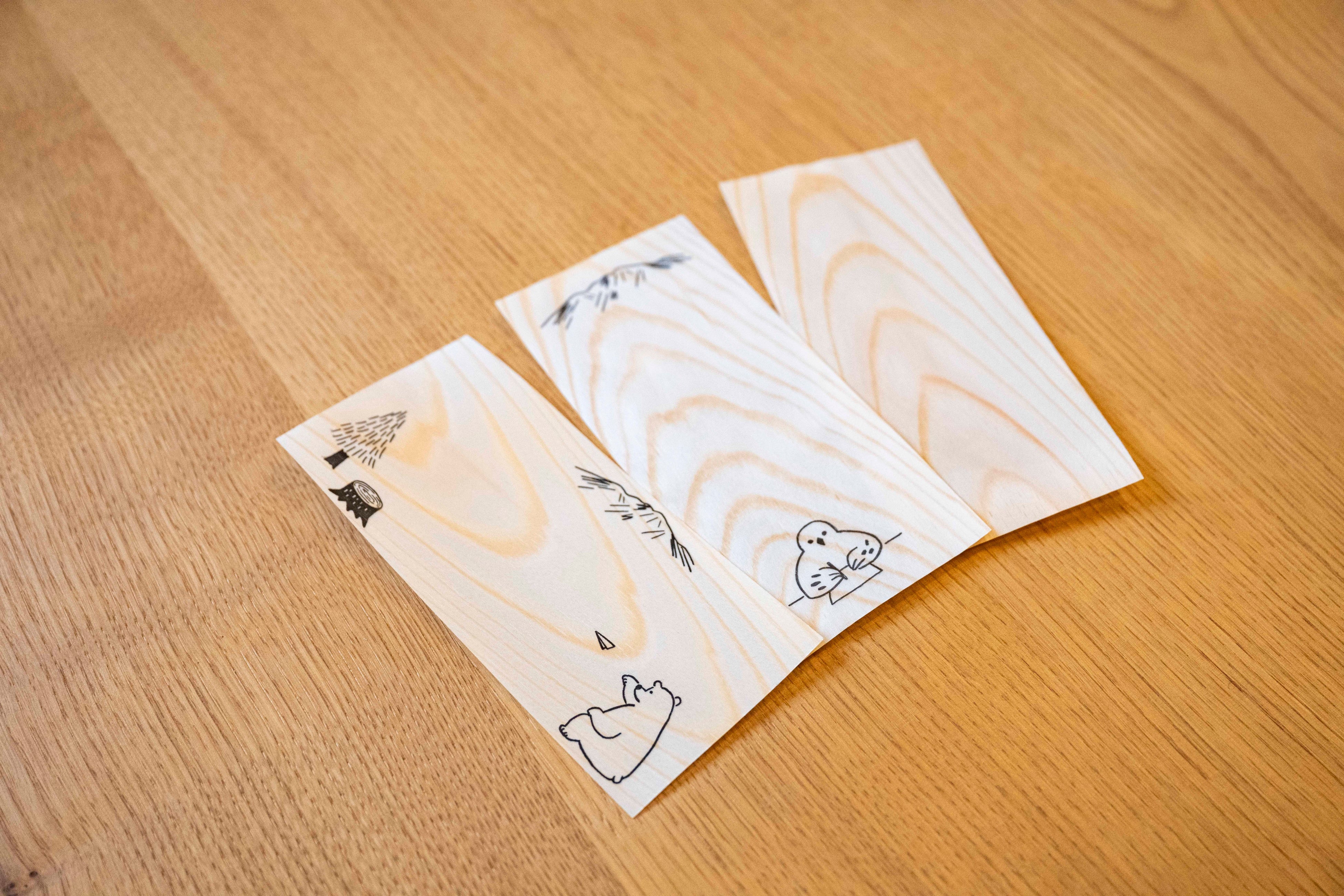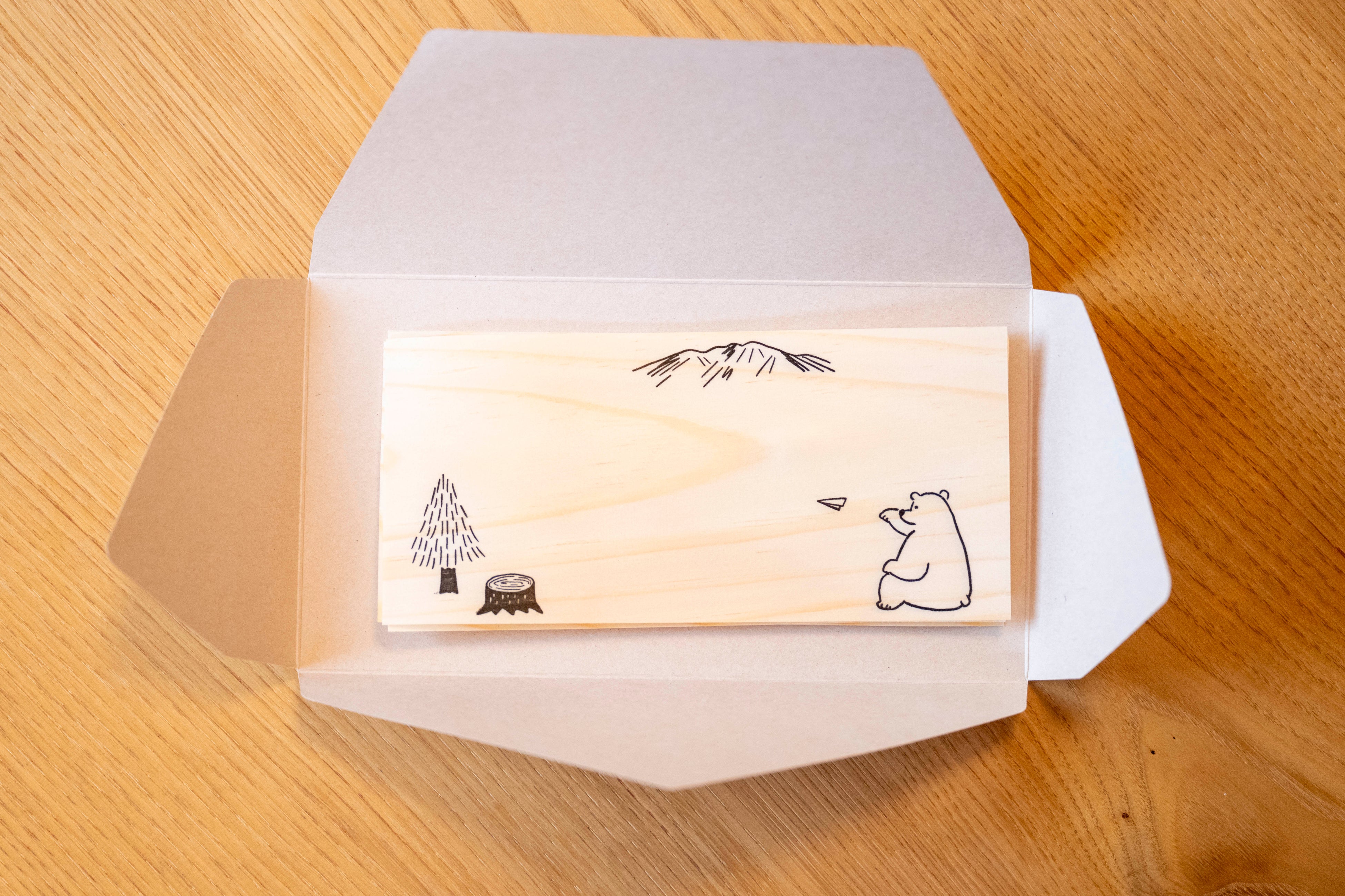 おにぎりを包んできた経木(きょうぎ)が、想いを綴る一筆箋に。森と人をつなぐ、新しいかたちの文具です。