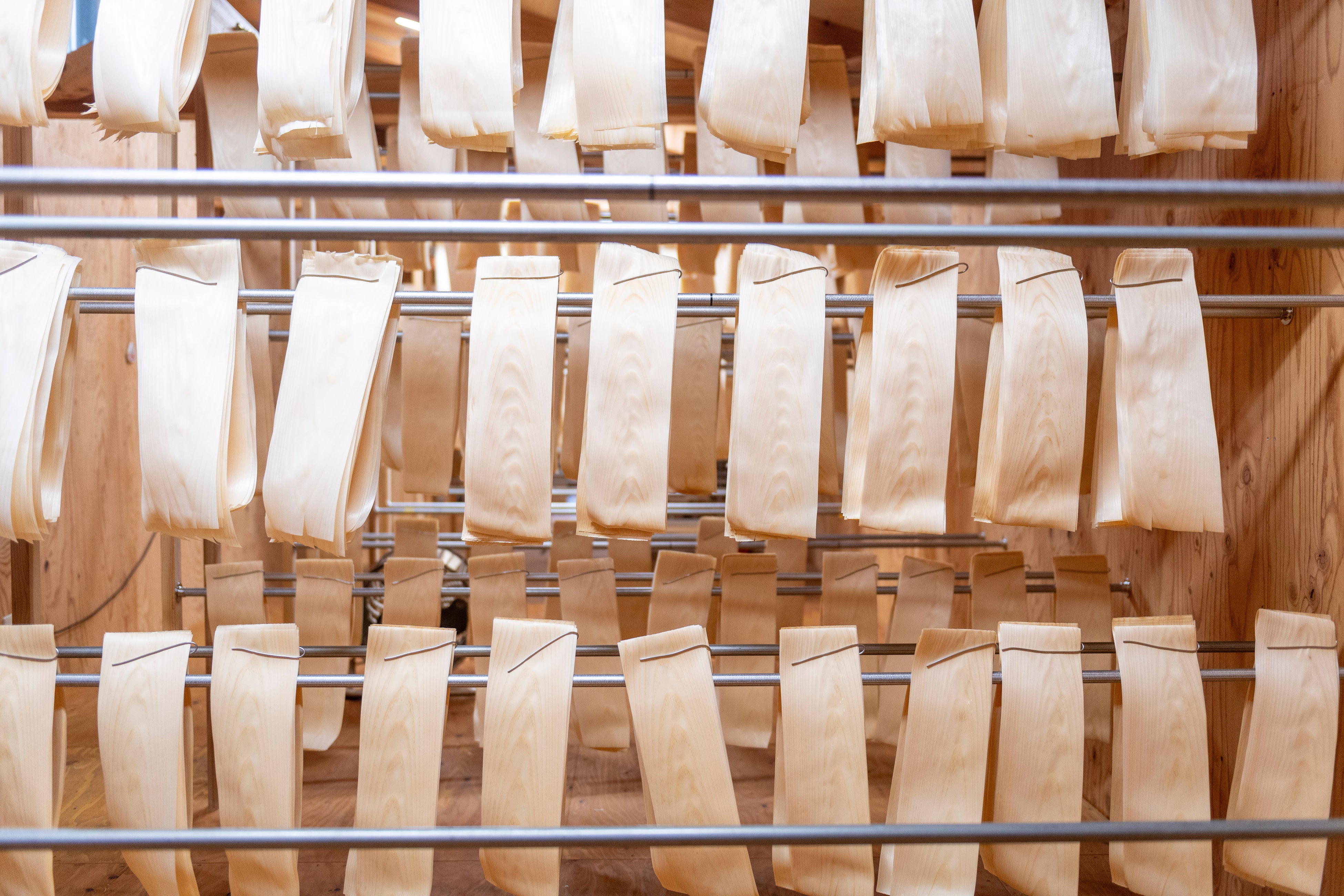 このアカマツが枯れる前に次の命を吹き込み、豊かな森林資源を次世代に受け継ぎたい。そんな想いから、伊那谷のアカマツを紙のように薄く削ってつくる「経木(きょうぎ)」の生産をスタートしました。経木の古い機械の扱いや、木の特性を見極める削りに苦労し2年。2020年、ようやく「信州経木Shiki(しんしゅうきょうぎしき)」として販売を始めました。