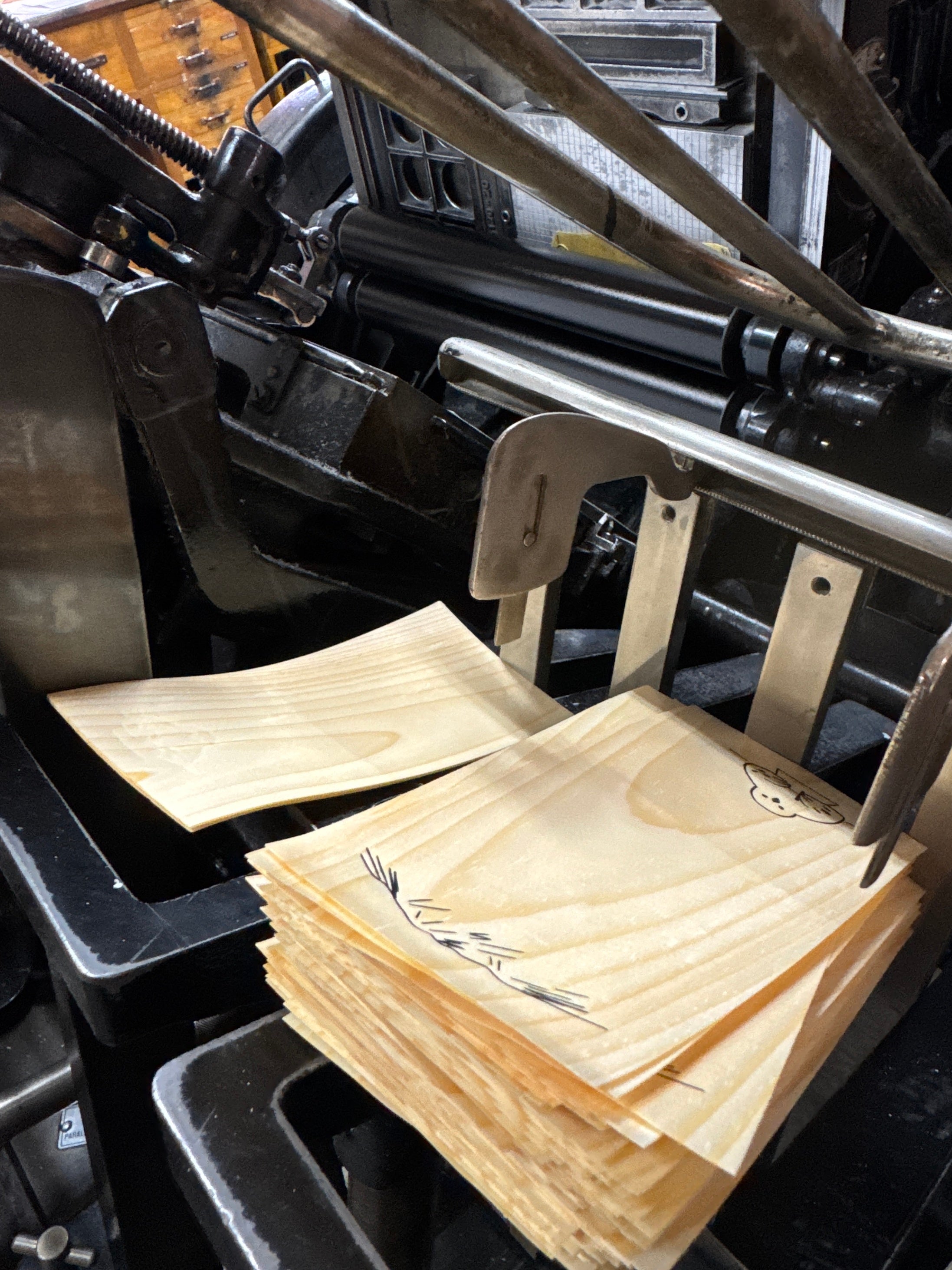 今回は初めて経木への活版印刷に挑戦。反ったり割れやすかったりヤニの影響が出たりと、紙と同じようにはいかない経木への印刷。これまで様々な印刷方法を試しましたが、機械に詰まってしまったり機械にダメージがあったりとなかなか実現しませんでした。今回は桜ノ宮 活版倉庫さんのご協力のもと、試行錯誤を重ね実現。経木の面白さや可能性が広がりました。木そのものの質感に加え、イラストとともに印刷の凹凸もお楽しみいただけます。