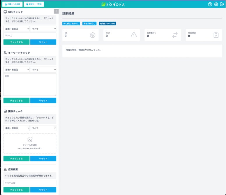 広告チェックツール『コノハ』は、薬機法・景表法・健康増進法・医療広告ガイドラインに特化し、誇大表現になる恐れがある箇所をぱっと指摘してくれるサービスです。