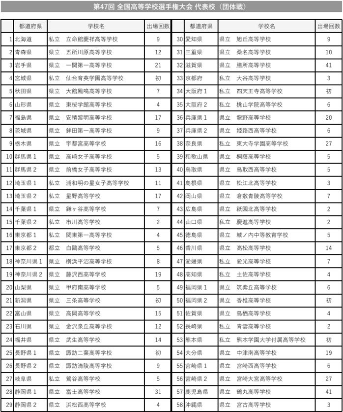 初出場校は、激戦区を勝ち上がった県立香椎高等学校(福岡県)をはじめとする6校。また、最多出場校は、41回目の県立膳所高等学校(滋賀県)と県立鶴丸高等学校(鹿児島県)の2校となります。