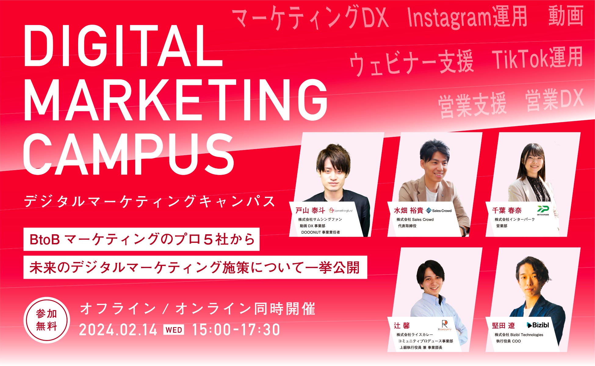 動画DX事業を展開する株式会社サムシングファン(大阪府大阪市、代表取締役社長:薮本直樹)は、デジタルマーケティングに関する企業が一堂に集合しセミナーと名刺交換を行うデジタルマーケティングキャンパス2024(DMC2024)を2024年2月14日水曜日に東京都渋谷区でのオフラインとオンラインのハイブリッドで開催することを決定しました。