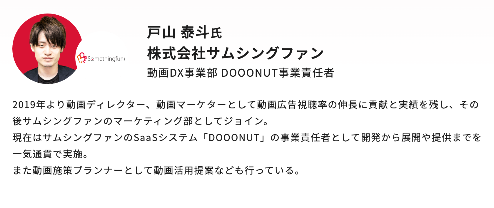 動画活用を検討する企業がもつ課題を「動画DX®︎」サービスによって解消します。動画配信SaaS「DOOONUT」の開発販売、9000名以上の動画クリエイターリソースを提供するサムジョブ。900名以上のライバーが所属ライバーマーケティング事業を展開。