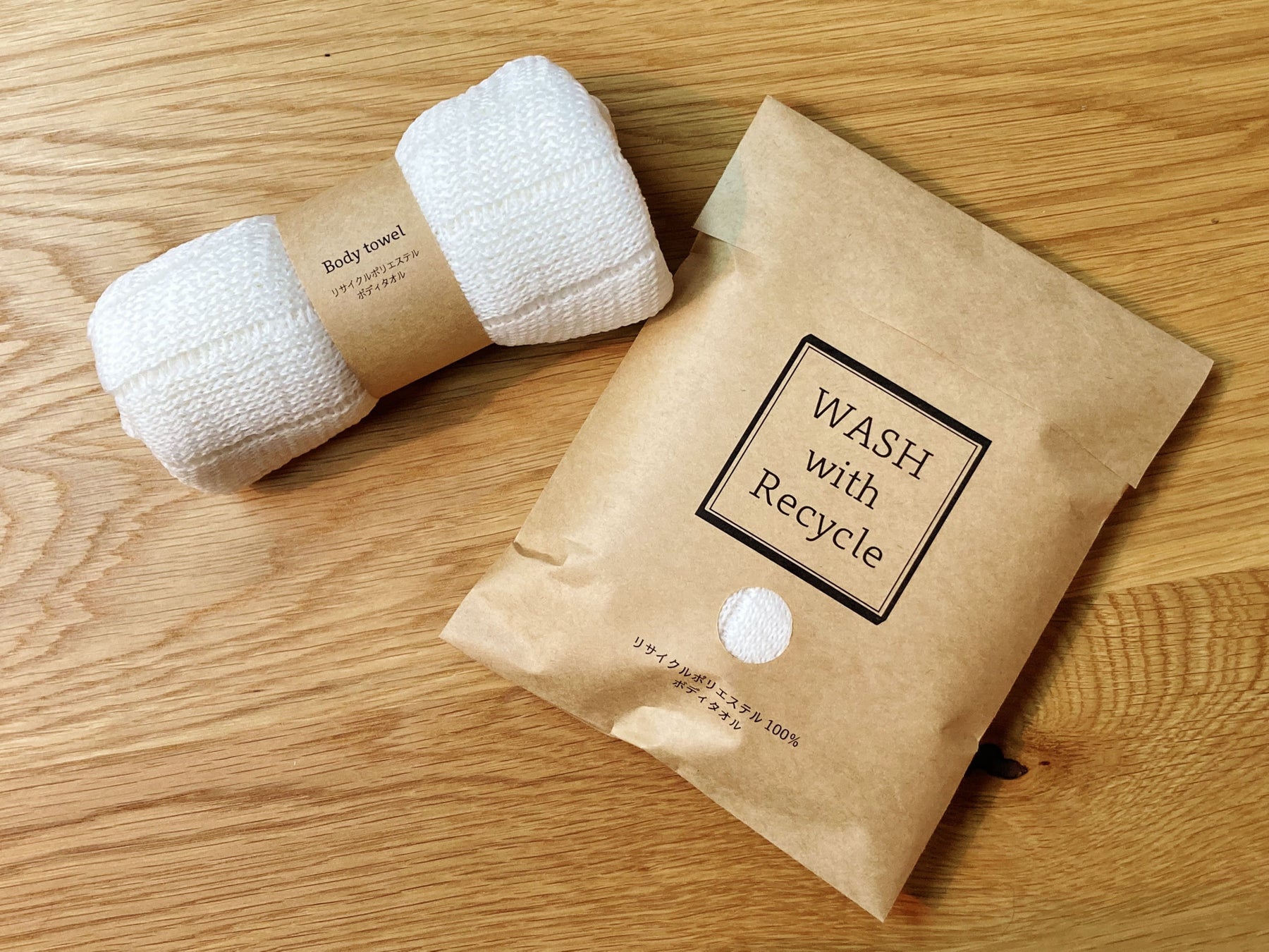 製品には廃ペットボトルを原料としたリサイクルポリエステル糸「ECO BLUE®」(エコブルー)を使用しています。強伸度が高く、また、安定した高い品質を供給することができます。企画から約2年かけて完成したボディタオルは、エコ素材100%にこだわる一方で、難点となっていたのが素材の柔らかさです。伸縮性が高すぎるとほつれやすく、また使いづらさも出てくるため、素材の配合を変えることも考えましたが、編み方や長さに改良を重ねることで使い心地の良いボディタオルが完成しました。包材は、帯巻き、袋入りとご要望に合わせて変更可能です。