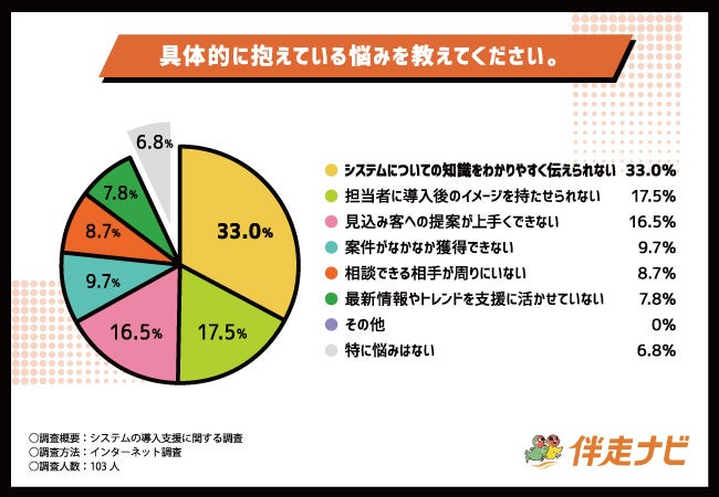 また、導入支援をする前段階となる営業や顧客とのコミュニケーション、商談・クロージングといった悩みも非常に多く見られる結果となりました。