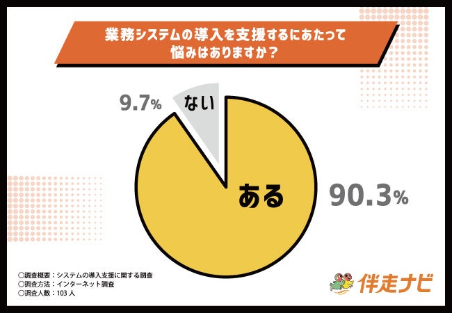 今回の調査で、システムの導入支援に関して悩みを抱えている方が『90.2%』、特に『導入後の運用サポート』で苦戦しているとわかりました。