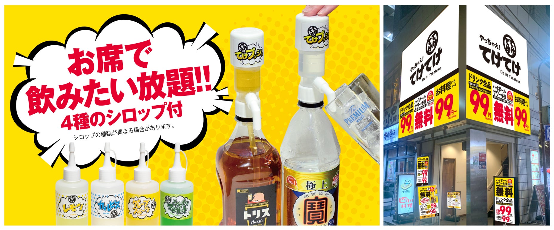 【生ビールも角ハイもドリンク全品99円!】 卓上飲み放題でハイボール&サワー 各種が無料で楽しめる『やっちゃえ!てけてけ』が3店舗オープン!