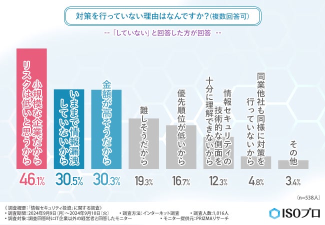 反対に『情報漏洩の対策をしていない』と回答した方に「対策を行っていない理由はなんですか?(複数回答可)」と質問したところ、『小規模な企業だからリスクは低いと思うから(46.1%)』という回答が最も多く、次いで『いままで情報漏洩していないから(30.5%)』『金額が高そうだから(30.3%)』となりました。