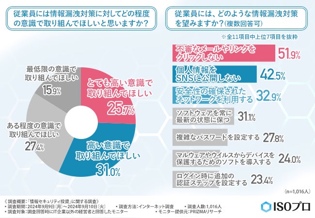 「従業員には情報漏洩対策に対してどの程度の意識で取り組んでほしいと思いますか?」と質問したところ、『高い意識で取り組んでほしい(31.0%)』『とても高い意識で取り組んでほしい(25.7%)』『ある程度の意識で取り組んでほしい(27.4%)』『最低限の意識で取り組んでほしい(15.9%)』となりました。