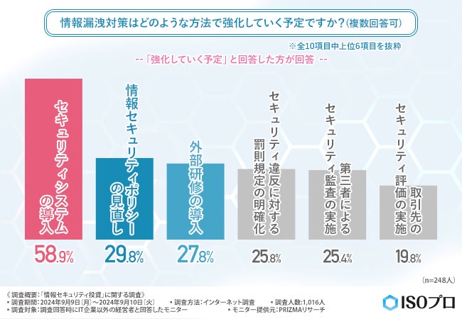 『強化していく予定』と回答した方に「情報漏洩対策はどのような方法で強化していく予定ですか?」と質問したところ、『セキュリティシステムの導入(58.9%)』という回答が最も多く、次いで『情報セキュリティポリシーの見直し(29.8%)』『外部研修の導入(27.8%)』となりました。