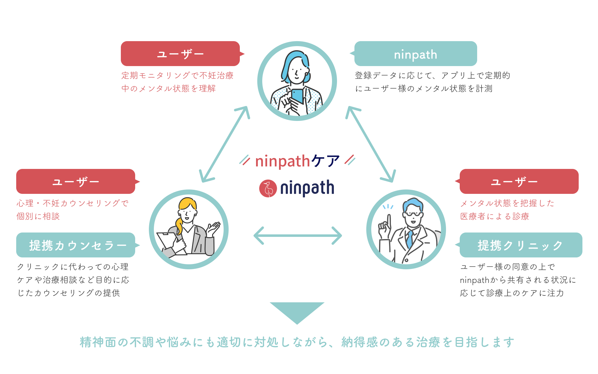 この結果を受けてninpathは「心理的負担を感じている不妊治療患者に向けた十分なメンタルケアはされておらず、適切なタイミングでカウンセリング等を受けるきっかけを提供する仕組みが必要とされている」と考え、自身のメンタル状態を気軽に診断でき、適切なケアラーへの導線をご案内できる『ninpathケア』の仕組みを構築いたしました。