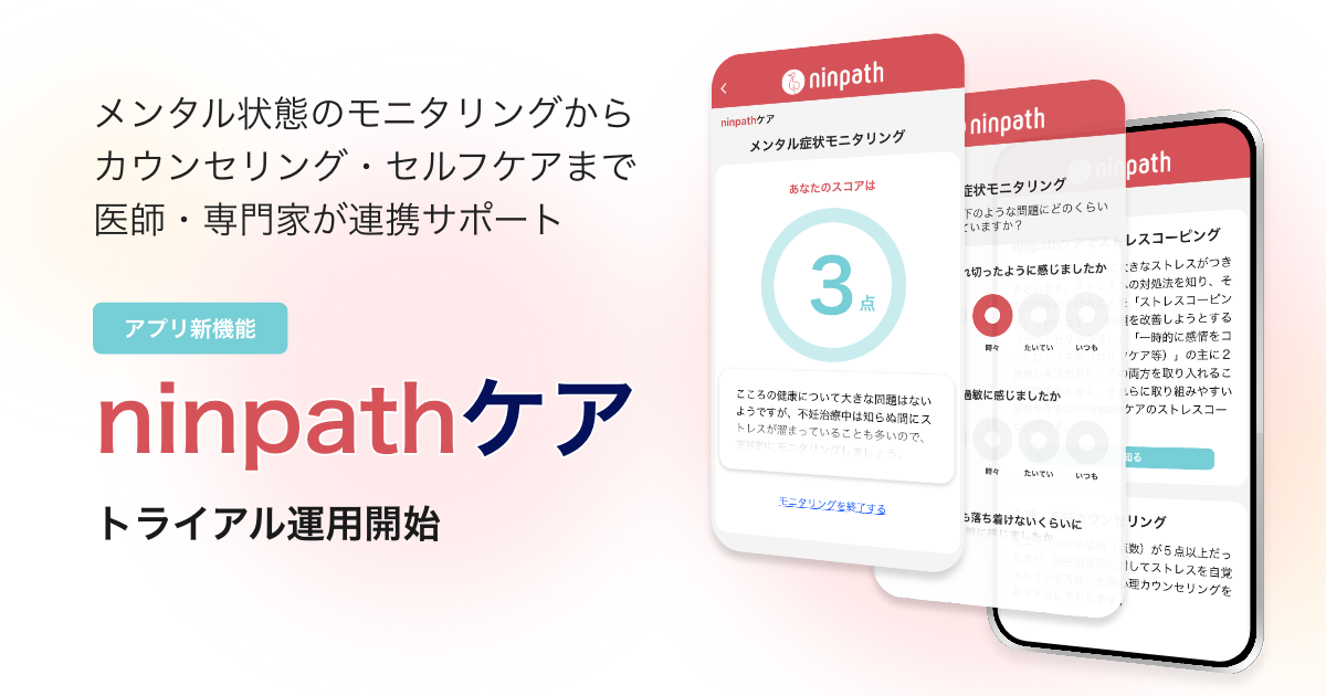 不妊治療可視化アプリ「ninpath」を提供する株式会社ninpath(本社:東京都港区、代表取締役CEO:神田大輔)は、不妊治療患者のメンタルを中心とした診療支援を行う新機能『ninpathケア』のトライアル運用を開始しました。