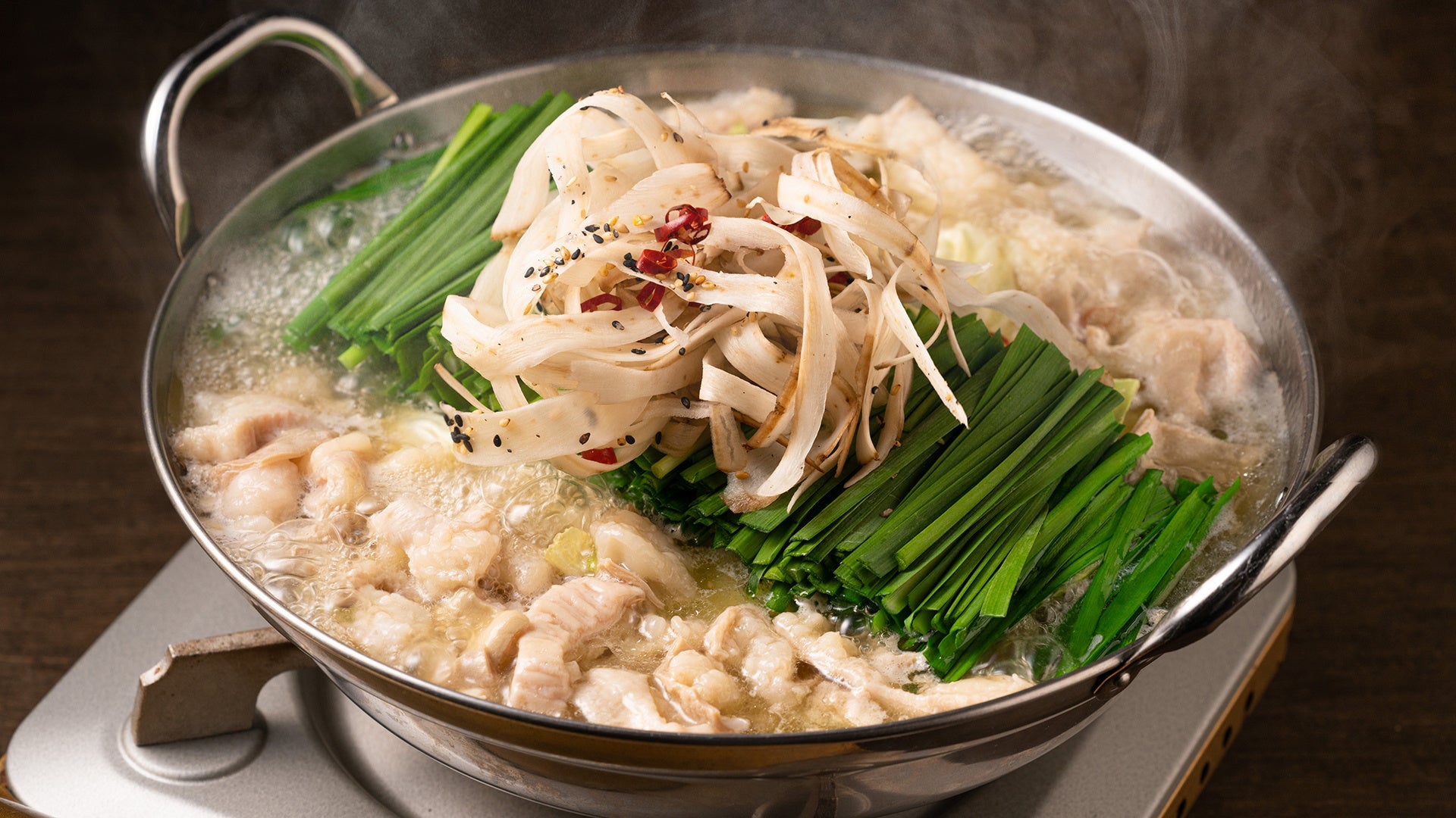 国産牛小腸とシマ腸。ぷりぷりの食感とコラーゲンたっぷりの博多もつ鍋。ダシは「醤油」「味噌」「明太」の3種類。〆はちゃんぽん麺がおすすめです。