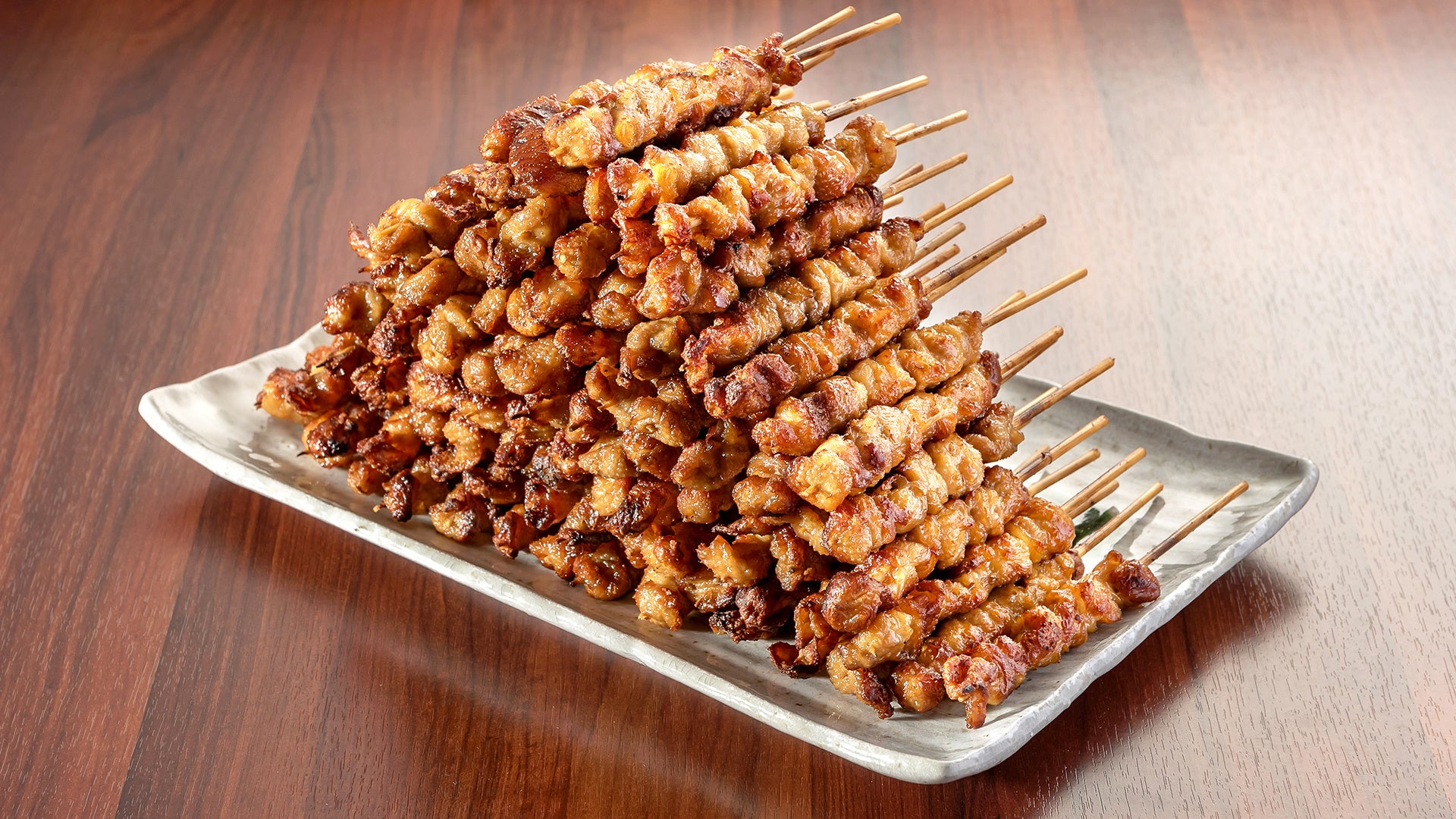 串に巻き付けるように刺し、焼いては寝かしを繰り返すことで、余分な脂をゆっくりと落とし、九州の素材をふんだん使ったとりかわ専用竹乃屋オリジナル秘伝のタレがじっくりと染み込ませ、外はカリッと中はもっちりとした食感に仕上げました。