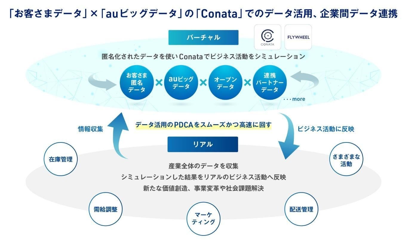 本提携では、フライウィールが提供しているプライバシー保護とデータ活用を両立するプラットフォーム「Conata(コナタ)™」、およびKDDIの保有するauビッグデータ(注)、KDDI Digital Divergenceグループのクラウド・アジャイル開発などのデジタル技術が連携します。お客さまデータとauビッグデータなどを元にConata上で企業のビジネス活動をシミュレーションし、デジタルツインとして再現、その結果をリアルなビジネス活動に反映します。