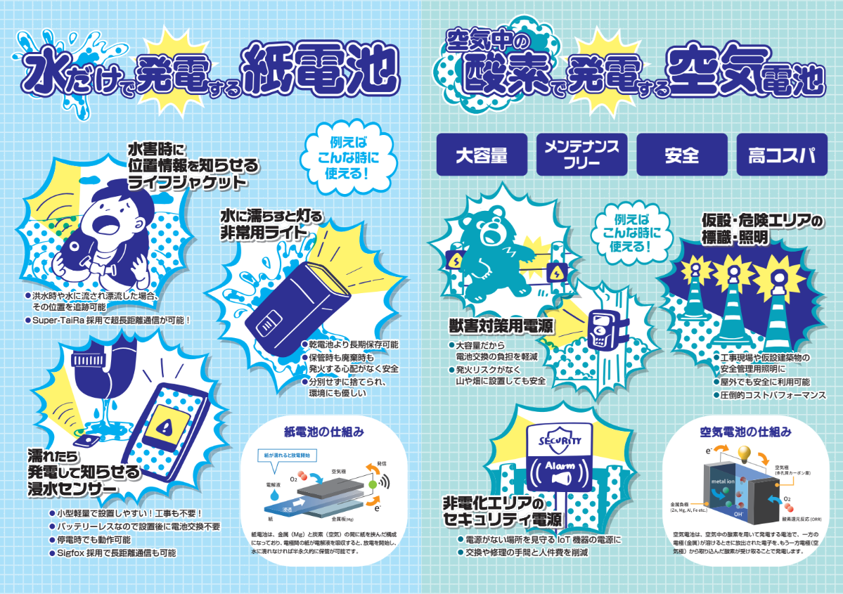 水に濡れると発電する紙電池は、長期保管が可能で廃棄も容易です。非常用ライト、水難時に位置情報発信するライフジャケット、バッテリーレス漏水センサーなど多様な用途で利用可能です。