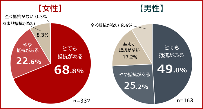 「全く抵抗がない」と答えた人の割合も、女性0.3%に対し男性は8.6%と差が目立ちます。