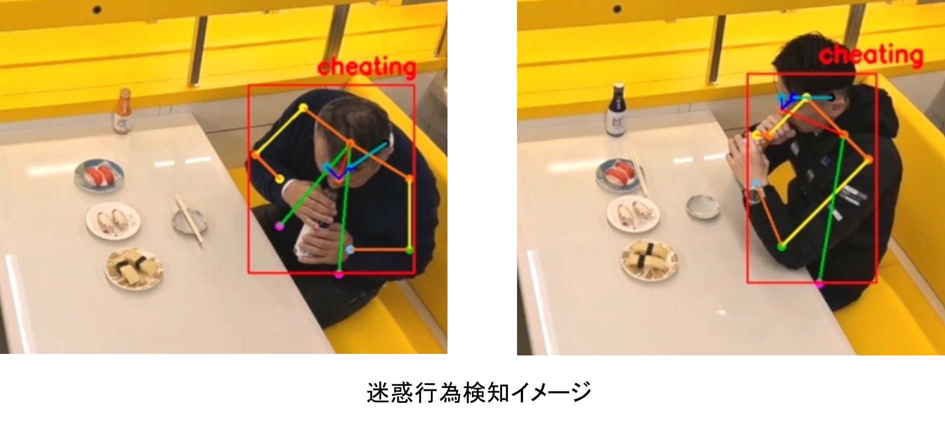 「迷惑行為AI検知システム」は、店内に設置されている防犯カメラの映像から、迷惑行為にあたる行動をAIが検知することで店内スタッフにお知らせする仕組みになります。下記のブースにてシステムのイメージをご覧いただくことができますので、この機会に、回転寿司店の迷惑行為対策にお役立ていただければ幸いです。