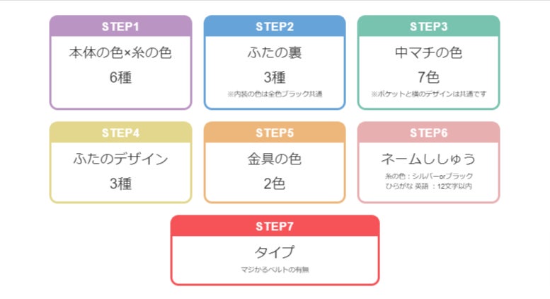 本体カラー、糸の色、ふたの裏(内装)、中マチ、ふたのデザイン、金具の色、ネームししゅうなど、多彩な組み合わせが可能で、子供たちの個性を反映したランドセルを作成できます。