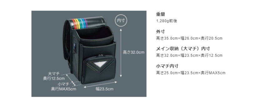 フラットファイル対応の大容量設計 (大マチ内寸:高さ32.0cm×幅23.5cm×奥行12.5cm、重量:約1,280g)で、日常の学用品をしっかり収納できます。
