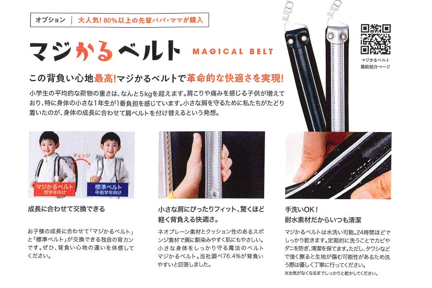 近年の重いランドセル事情にいち早く対応し、背負いやすく体の負担が軽減される「マジかるベルト」を開発。子どもに寄り添い耳を傾け、日々お客様第一に考え製品開発・生産に取り組んでいます。