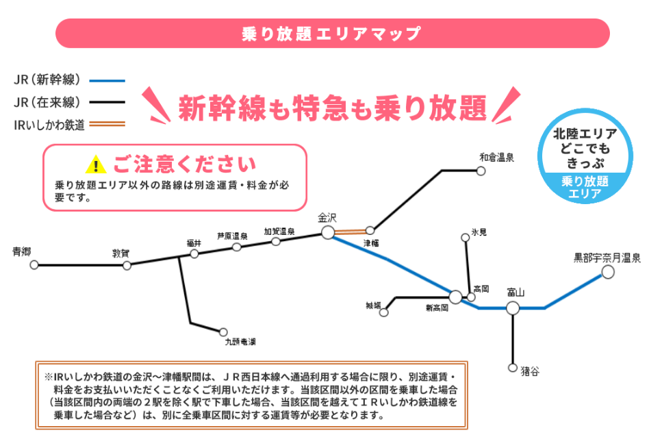 ※IRいしかわ鉄道(金沢~津幡駅間以外)、あいの風とやま鉄道、のと鉄道などは、ご利用になれません。