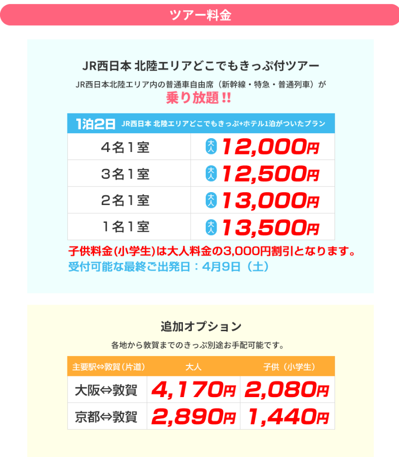 旅行会社限定のJR西日本 北陸エリアどこでもきっぷとホテル宿泊がセットになったツアーです。