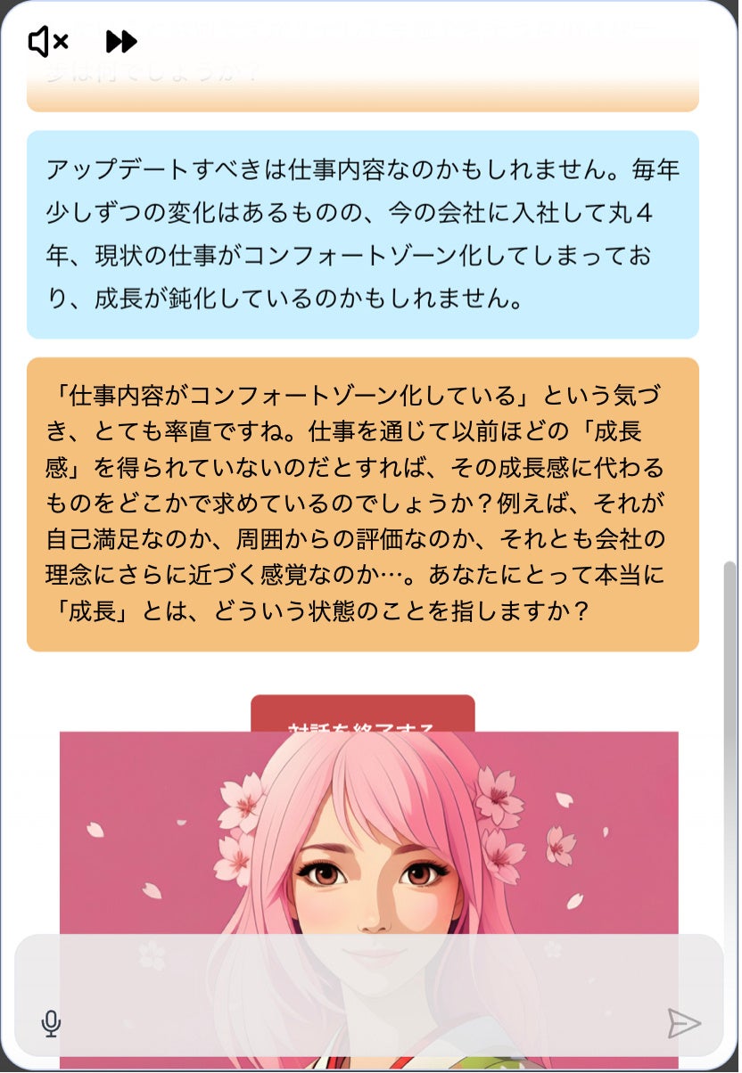 今回、当社では Xroid というプラットフォームを活⽤し、当社⽤に開発された AI メンターを準備しました。この AI メンターは、社員が 1on1 の前に対話する AI です。社員は AI メンターとの対話を通じて、⾃分の考えや悩み、キャリアへの想いを整理できます。AI メンターは“問いを与える愛ある存在”として社員の内省を⽀援し、1on1 の質的向上に寄与します。