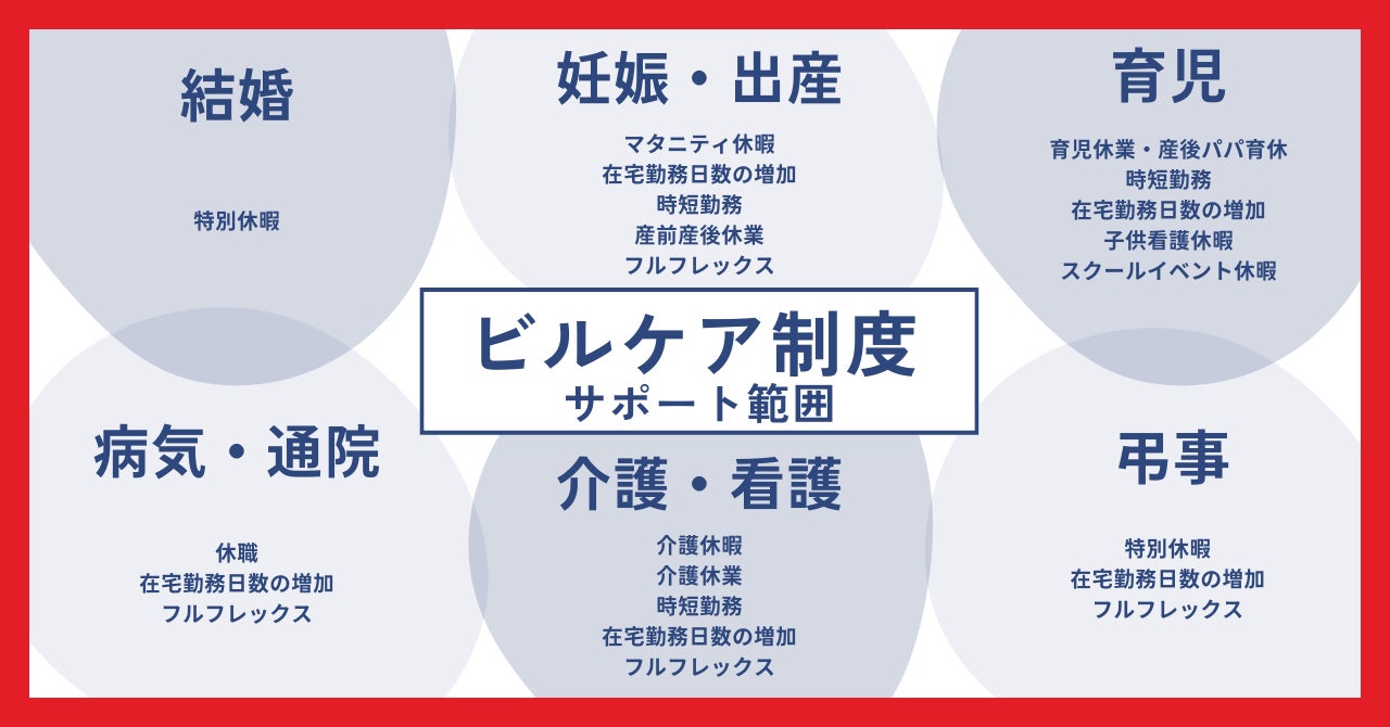 ビルコムでは、多様な従業員がプロフェッショナルとして長く活躍できる就業環境を目指し、これまでもフレックスタイム制、子供の看護や学校行事に伴う特別休暇など、多様な働き方を支援する制度を運用してきました。今回の「ビルケア制度」では、既存の制度を包含するとともに適用範囲を拡張し、事実婚パートナーや同性パートナーを含む家族のケアのほか、ペットのケア、自身の通院など、より広い範囲のライフイベントに対応します。