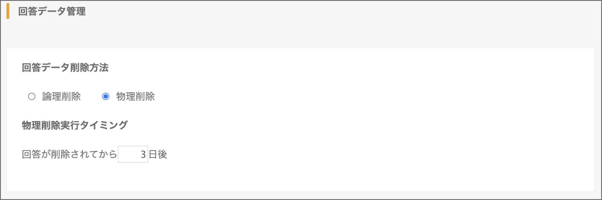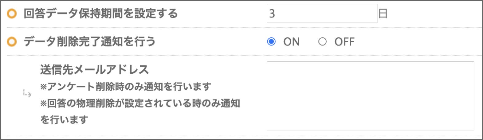 アンケートごとに回収した回答データの保持期間を設定できるようになります。アンケート回答完了日を起点に設定した日数経過後、データ削除します。