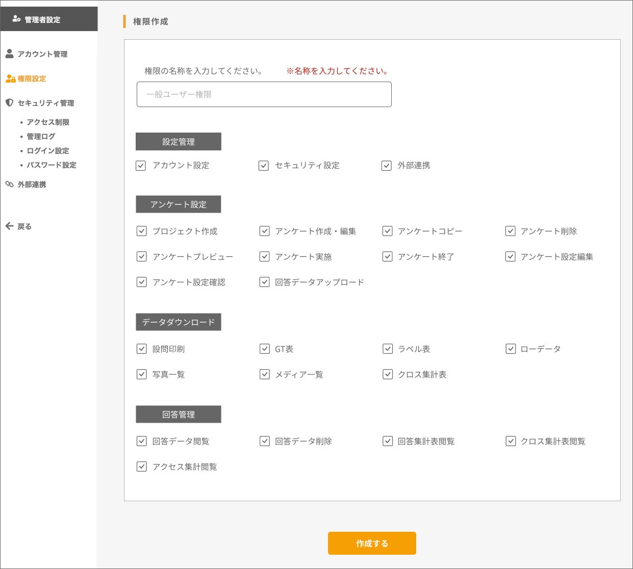 個人情報の回答データの閲覧権限を設定できます。回答データの個人情報は「作成者アカウント」で閲覧可能、「閲覧者アカウント」で閲覧不可に設定しています。
