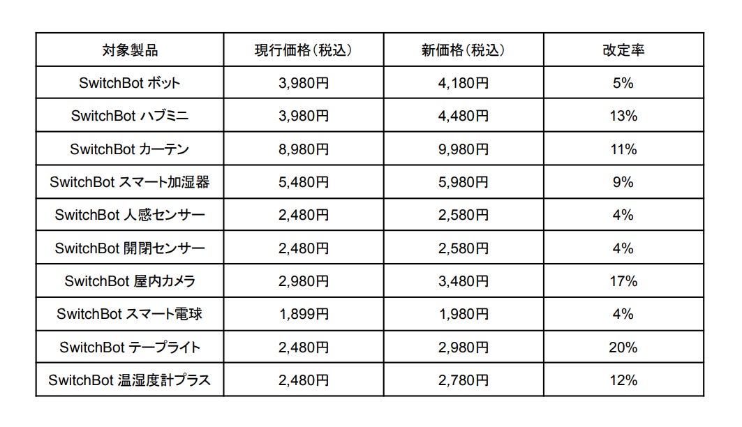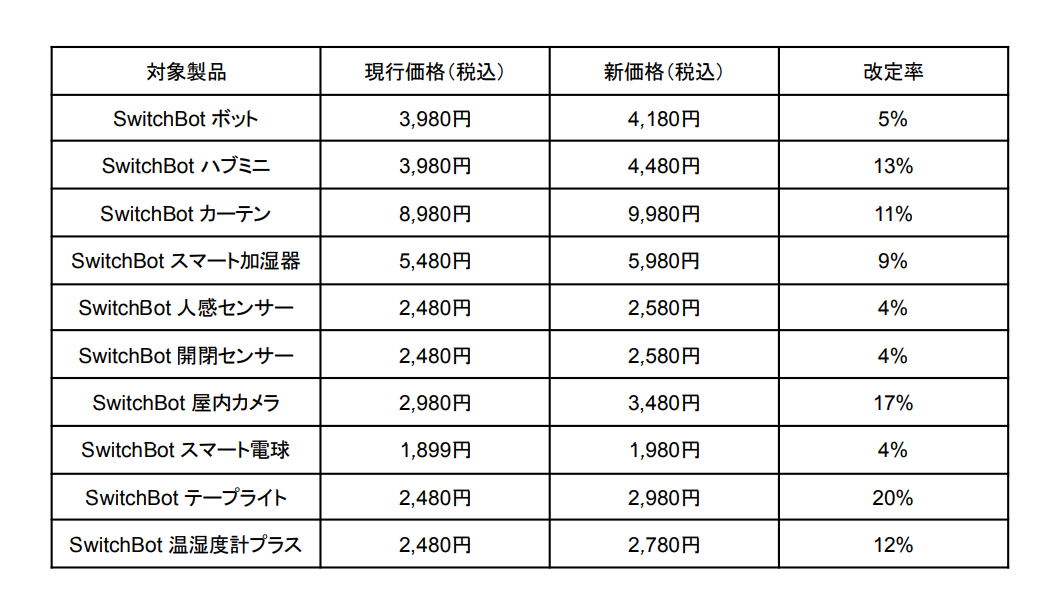 コンシューマ向けIoT・スマートホーム事業を手掛けるSWITCHBOT株式会社(本社 : 東京都目黒区)は、8月1日(月)より、一部製品の価格改定を実施させていただきます。