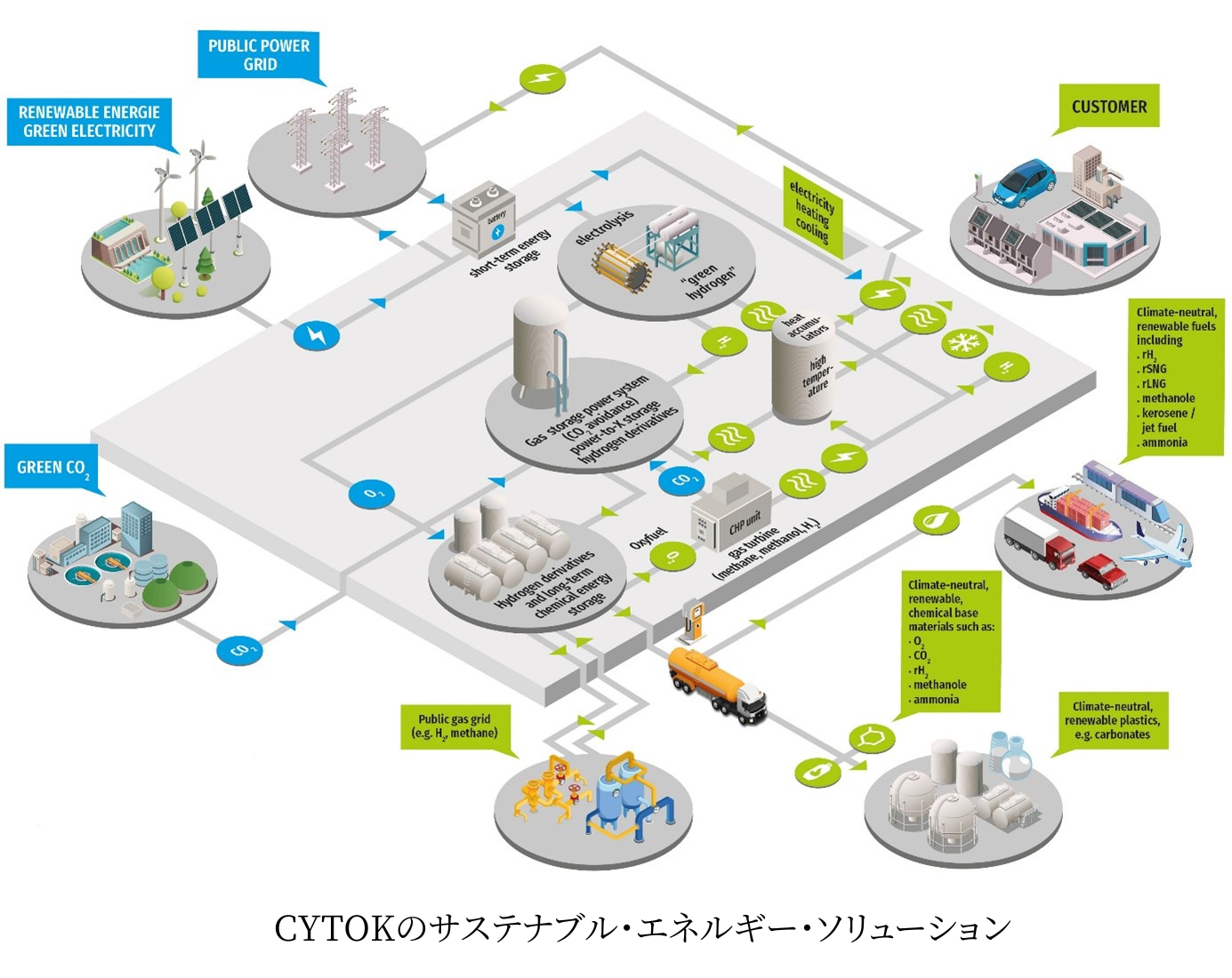 ドイツのCYTOK GmbHは、革新的な技術を持つ企業であり、再生可能な資源からグリーンな電気、暖房、冷房を供給するPower-to-Gasエネルギーシステムの数少ないサプライヤーです。ドイツ北東部ロストック市で開発されたPower-to-Gas技術を用いた、排出ガスを出さない蓄電システムなど、世界的に特許を取得している技術を持っています。( https://www.linkedin.com/company/cytok/ )