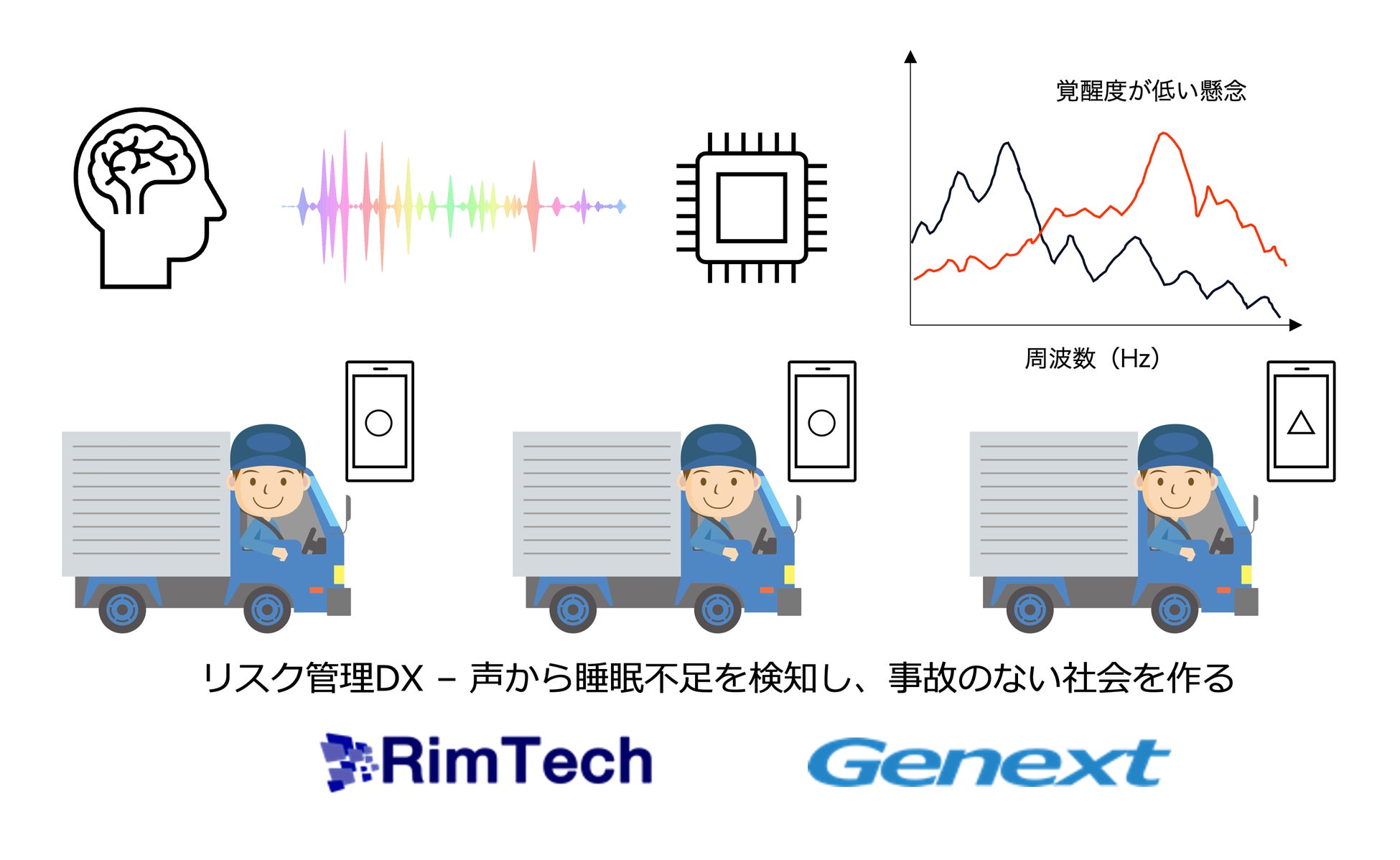 このプロジェクトでは、発話音声から睡眠不足を検知し交通事故を減らすリスク管理DXの開発を行います。RimTechが持つ「音声解析技術×データアナリティクス×リスク管理技術」を駆使することで、発話音声から睡眠不足を検知し、交通事故削減という社会課題の解決を目指します。