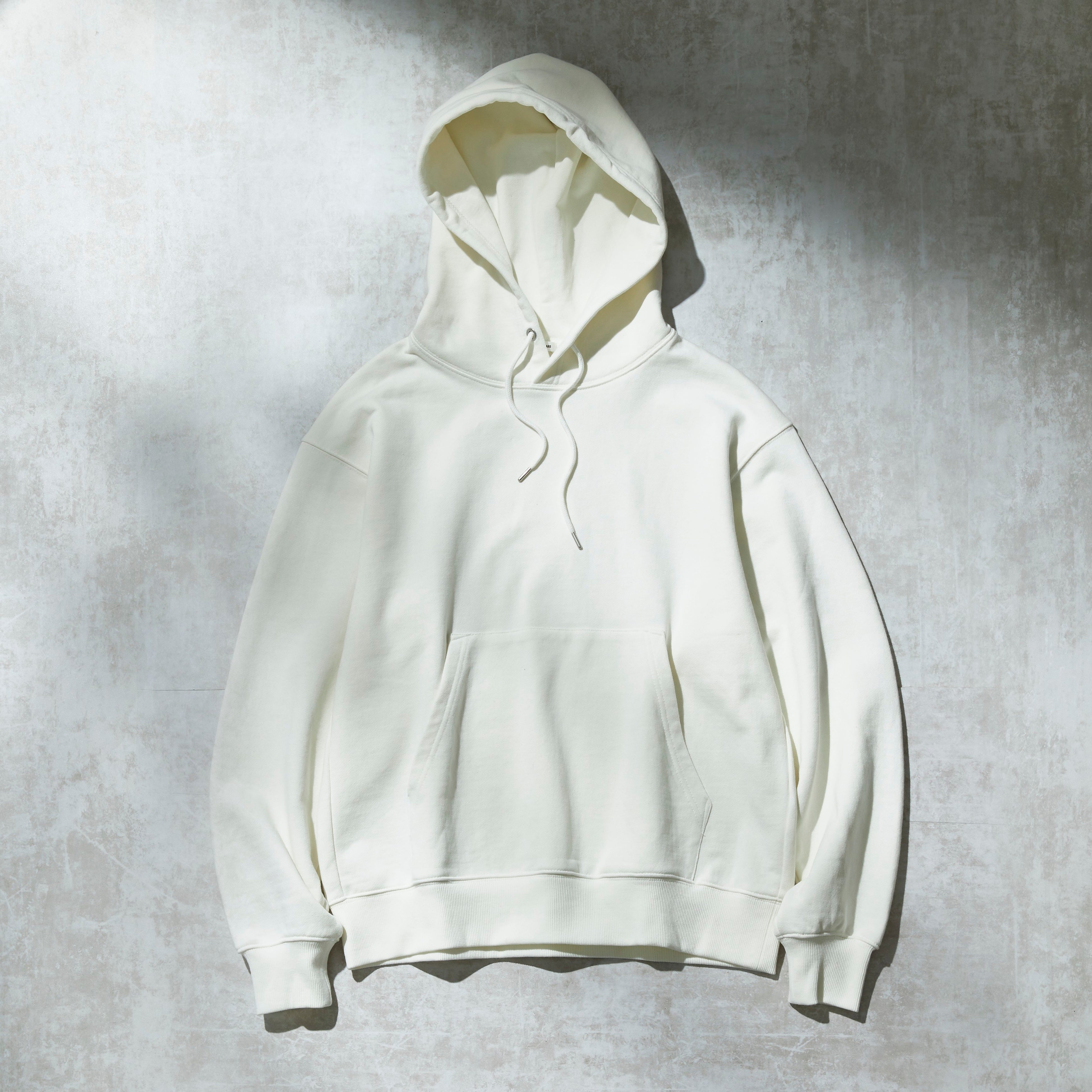 既存のパターンを見の直し、フードの立ちにこだわった設計で、サイズ、形、フロントの重なり部分を見直すことで程よいリラックス感のあるボックス型のプルオーバーパーカに。大き目のフードのスピンドルには先端にチップを、カンガルーポケットをやや大きめにする事でアクセントに。11.2ozの肉厚でタフなヘビーウエイト裏毛素材を使用。
