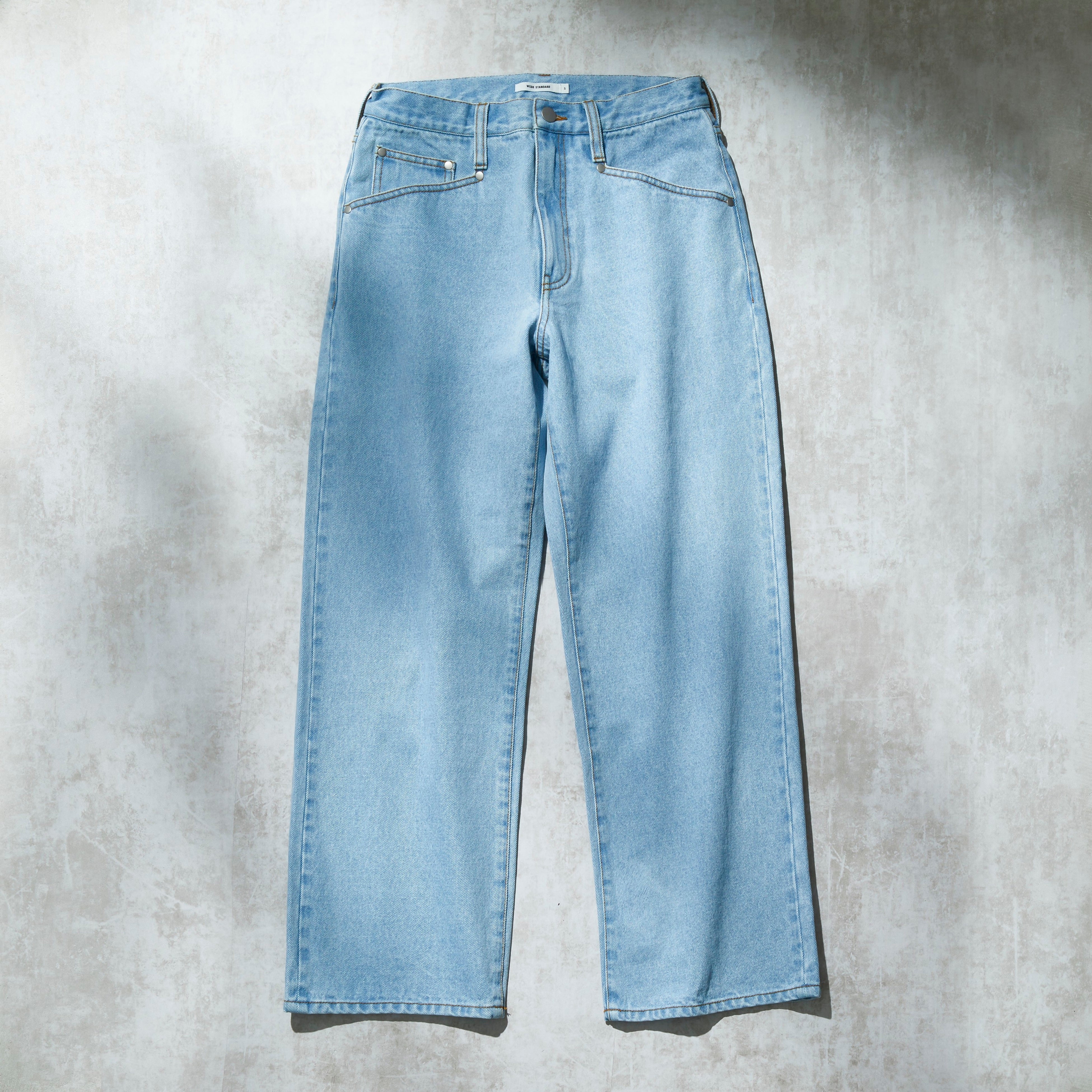 型別に角度を変えるているWEGO STANDARDオリジナルのL字の鋭角なフロントポケッデザインを採用。またアクセントのリベットにプレーンな物を使用し、ステッチでディテールに変化を加える事でシャープな印象を与えつつも、幅広く使用できる馴染みの良いデザインに。12.5ozの程よい肉感のデニムを使用し、加工感にこだわり程よいヴィンテージ感を出している。